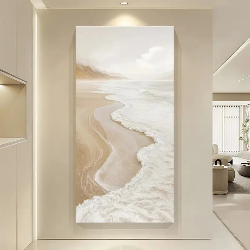 Soft waves curl gently across warm sand in this serene coastal scene. Golden Shoreline captures the quiet rhythm of sea meeting land, with muted beige and ivory tones that complement any interior. Perfect for creating a calming focal point in living rooms, bedrooms, or entryways, this tall canvas brings a touch of seaside tranquility to your home.
